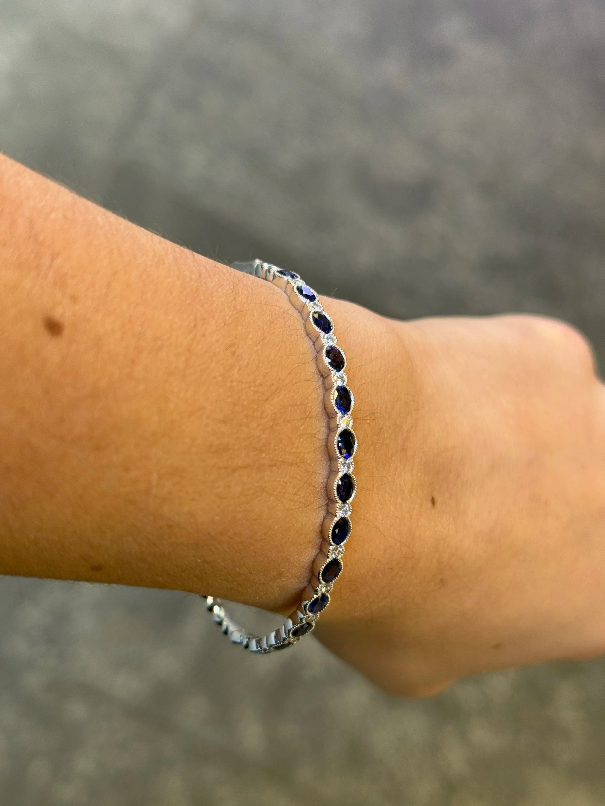 Ladies Alternating Round Diamond and Sapphire Bangle with Milgrain Style