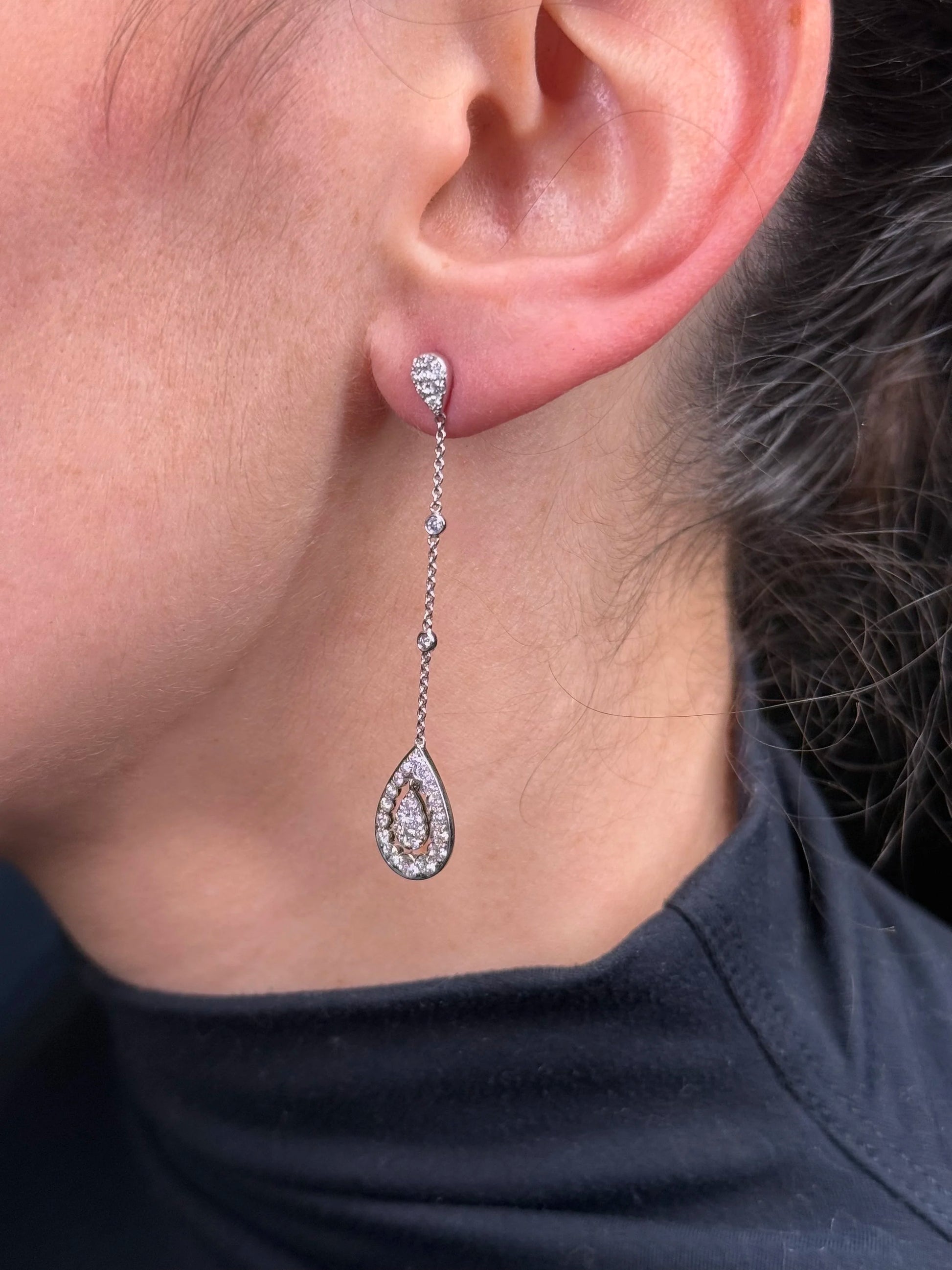 Ladies Bezel Chain Dangle Spaced Out Pave Set Pear Cluster Earrings