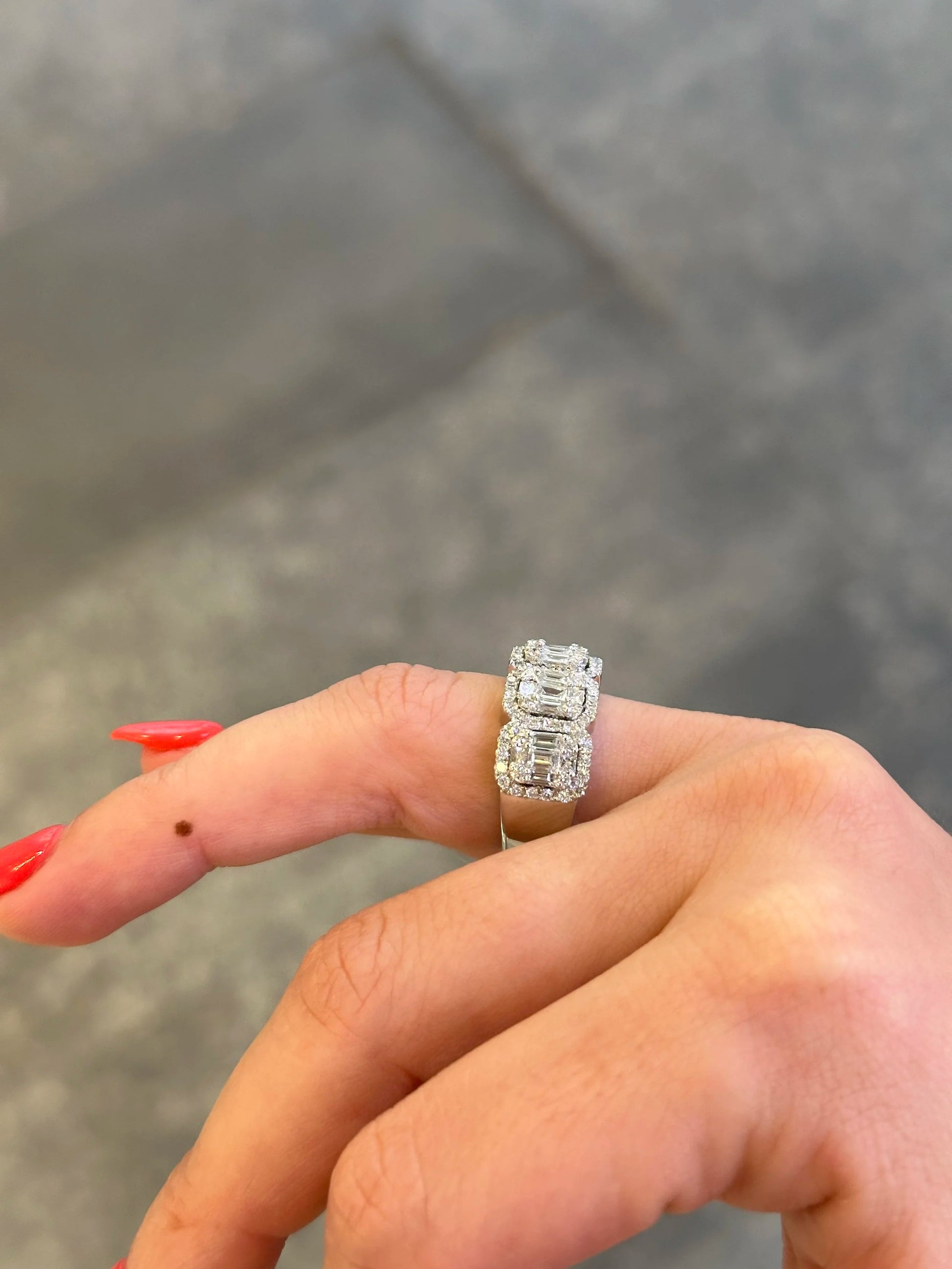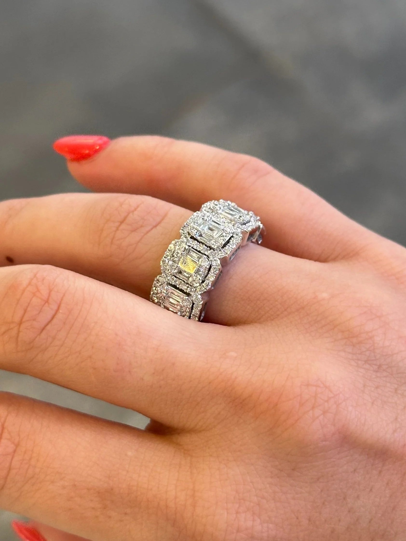 Ladies Five Emerald Shaped Cluster Ring with Halo