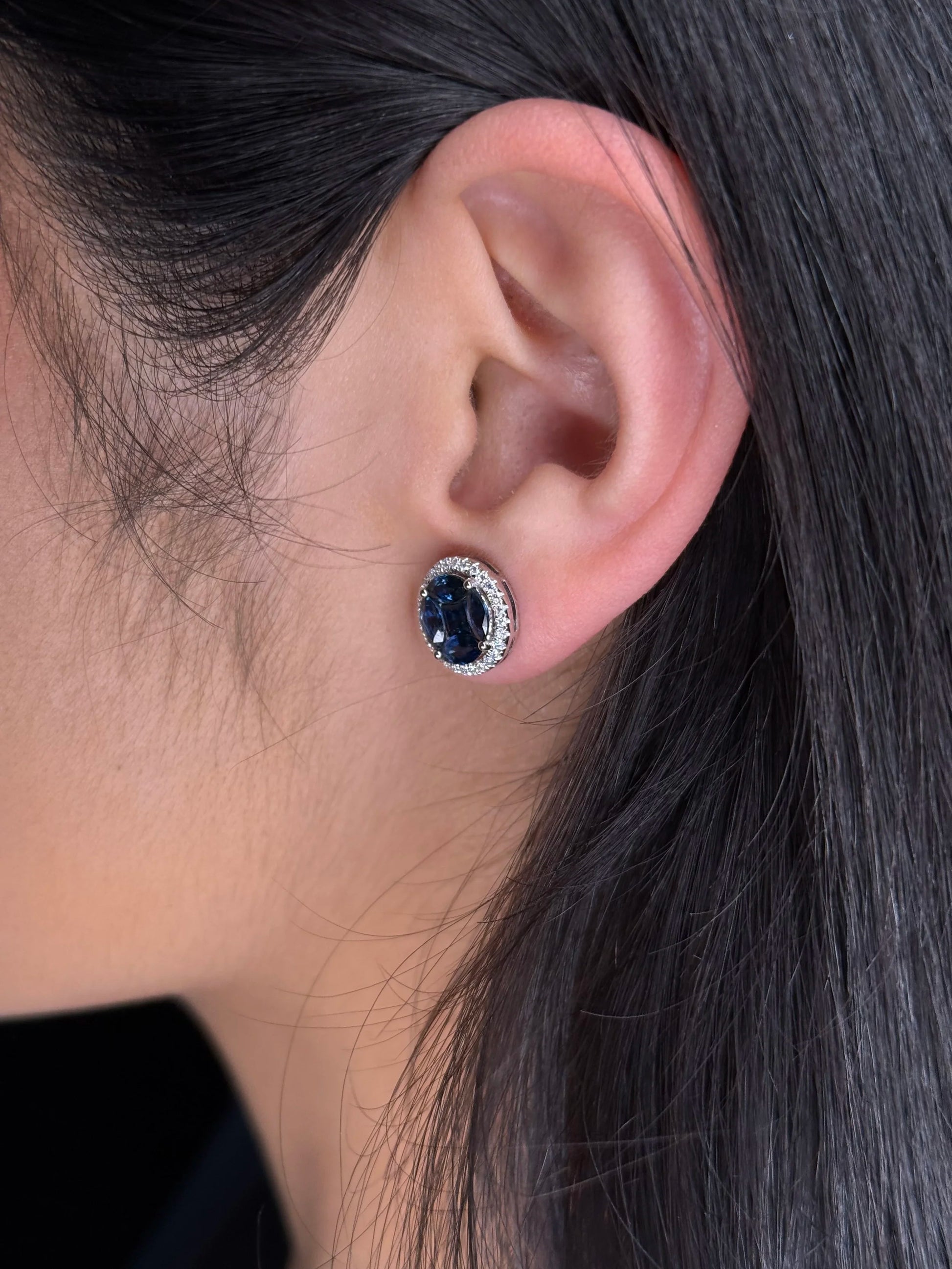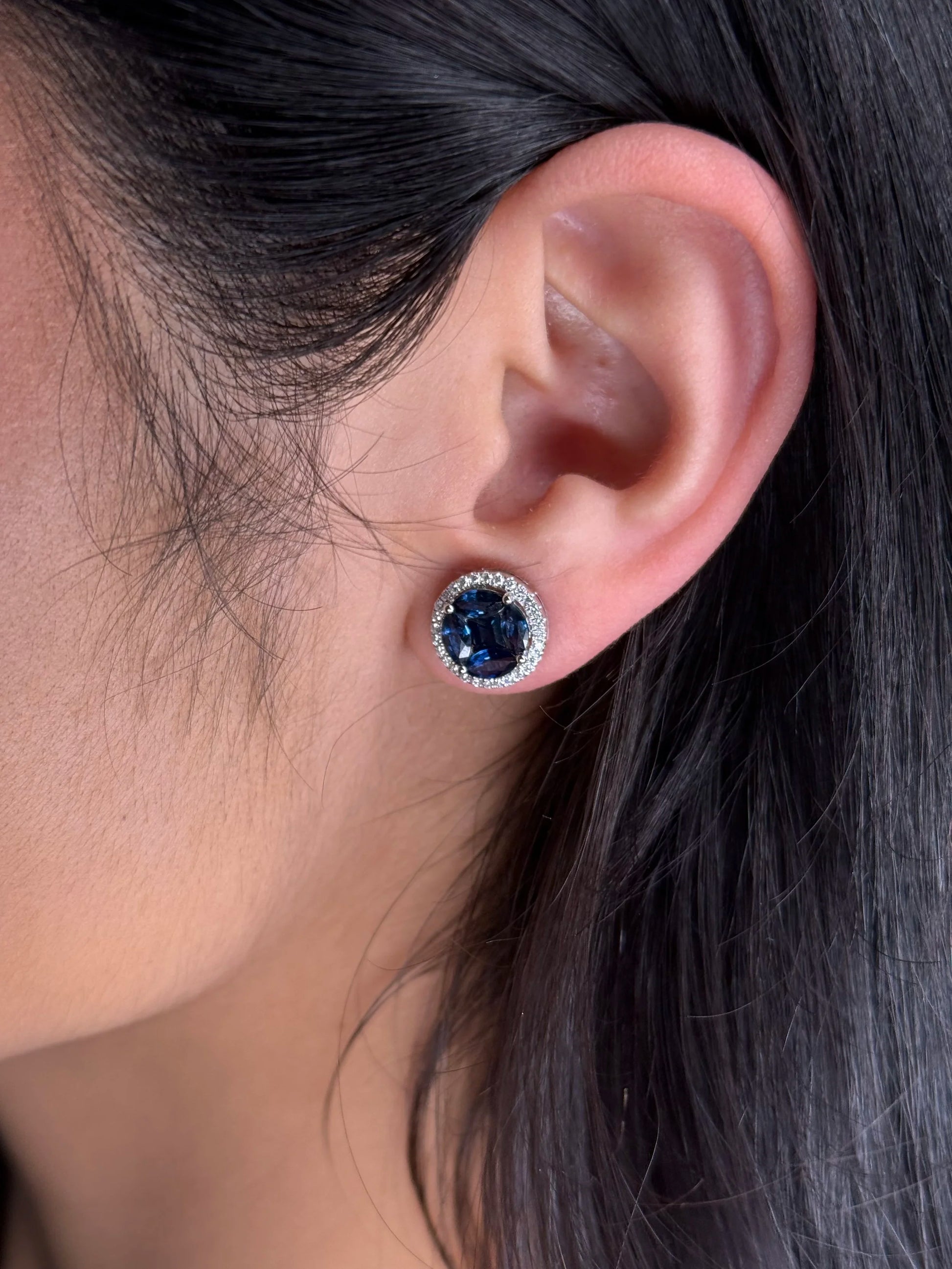 Ladies Sapphire Cluster Center and Halo Round Diamond Earrings