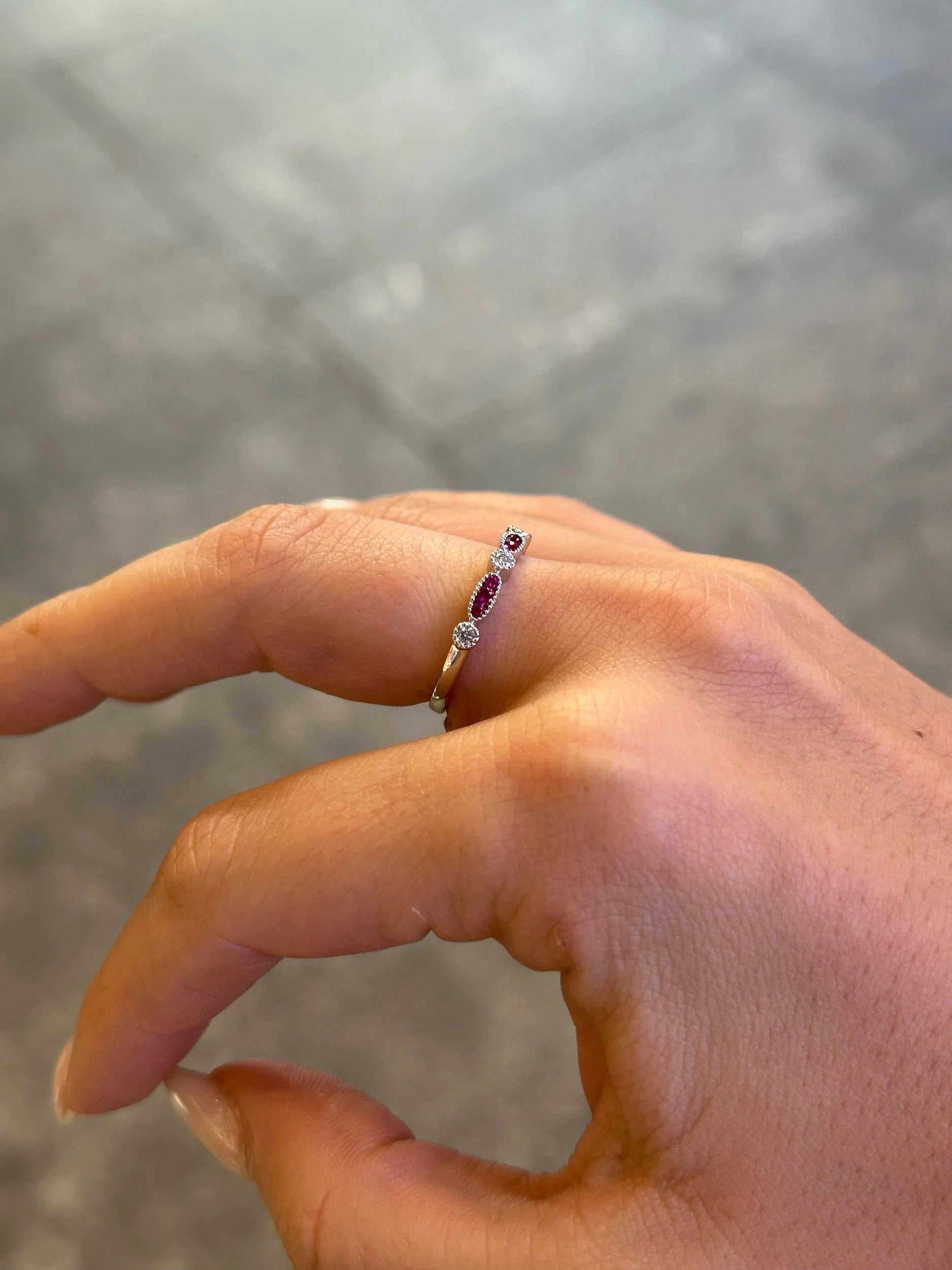 Ladies Three Ruby Stone and Round Diamond Alternating Ring