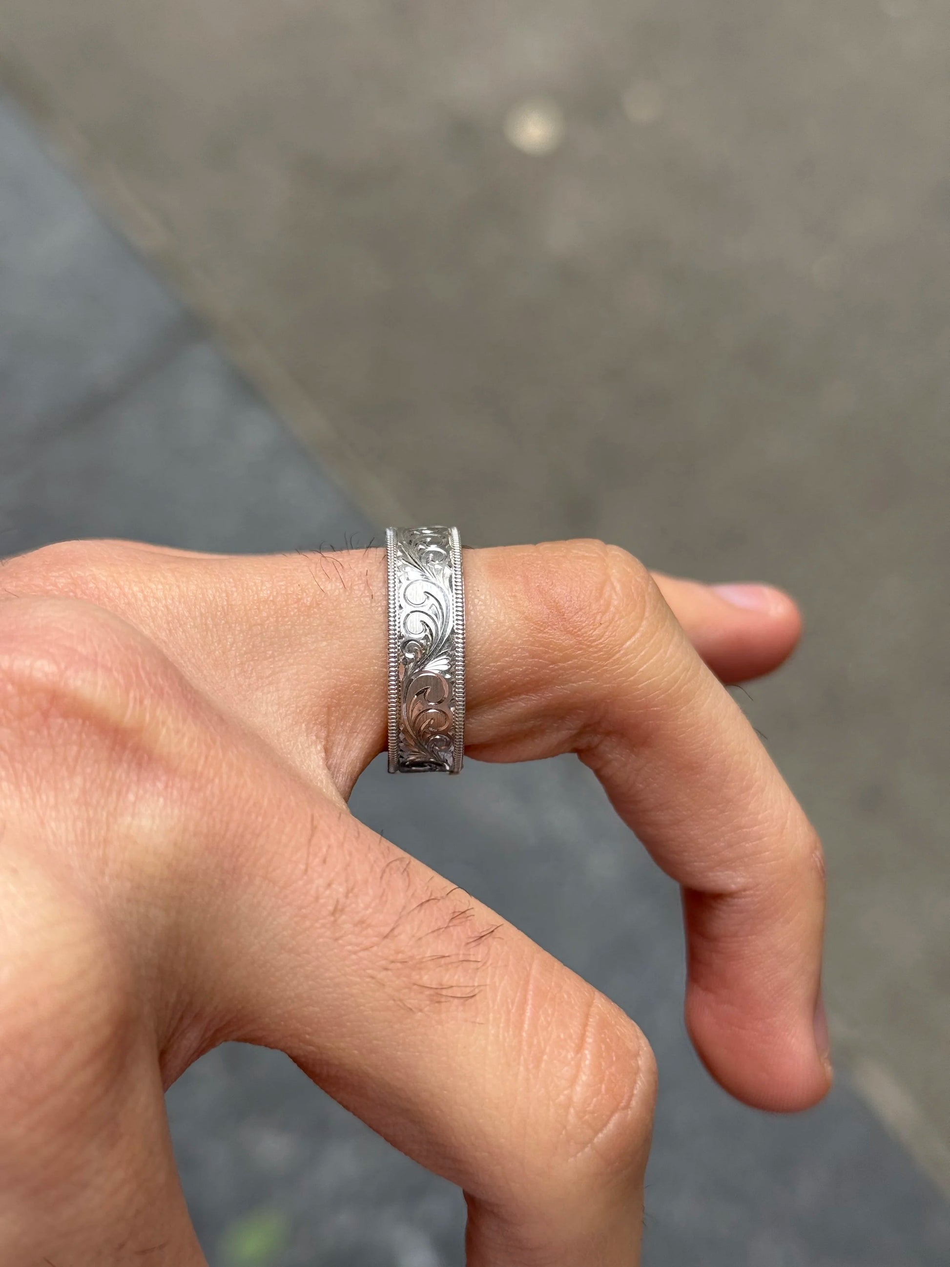 Men's Hand Engraved Center with Miligrain side Wedding Band